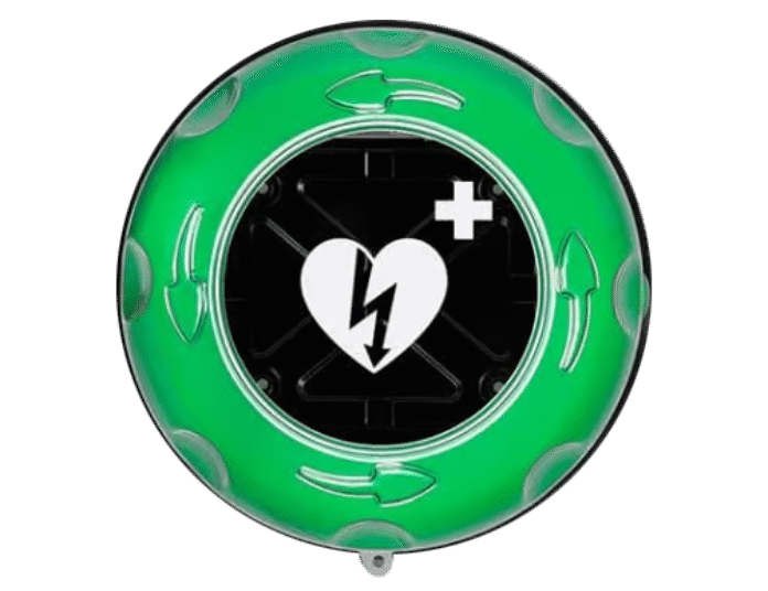 Dess distinkta runda form och igenkännbara LED-ljus gör den väl synlig och lätt att hitta – dag som natt. Det transparenta locket har en stor AED-logotyp, fyra tydliga och markerade pilar för vägledning och åtta spår för maximalt grepp i alla väderförhållanden.